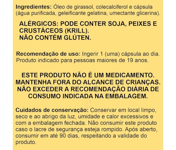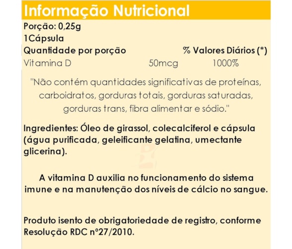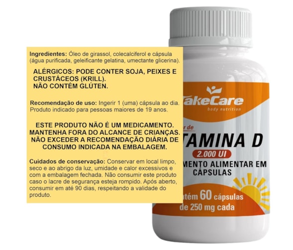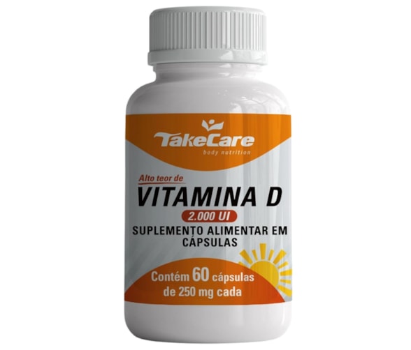 VITAMINA D3 2000UI COLECALCIFEROL 60 CÁPSULAS – TAKE CARE DescriçãoA vitamina D auxilia na formação de ossos e dentes, na absorção de cálcio e fósforo, no funcionamento do sistema imune, no funcionamento muscular, na manutenção de níveis de cálcio no sangue e no processo de divisão celular.Como todos já conhecem, sabe da importância em nosso corpo. Conhecida também como a vitamina do sol ela faz parte do grupo de micronutrientes, substâncias de extrema importância para as funções biológicas, a vitamina D exerce o papel de fortalecimento do sistema imunológico.E não para por aí não, a Vitamina D3 traz diversos outro benefícios, entre eles no metabolismo dos ossos, ajudando na prevenção de doenças como raquitismo, osteomalácia e osteoporose, no sistema neuromuscular atuando em funções que envolvem desde a síntese proteica até a cinética de contração muscular, e por fim podemos dizer que a deficiência desta vitamina pode ocasionar o acúmulo de gordura corporal. Benefícios- Sistema Imune;- Auxilia na formação de ossos;- Auxilia na formação de dentes;- Auxilia na absorção de cálcio;- Auxilia na absorção de fósforo;- Auxilia no funcionamento do sistema muscular;- Auxilia na manutenção de níveis de cálcio no sangue;- Auxilia no processo de divisão celular;- Contribui contra a fraqueza muscular;- Aliada na melhora do desempenho cognitivo;- Combate o envelhecimento da pele;- Auxilia na redução de perda de massa óssea. Sugestão de usoIngerir 1 (uma) cápsula ao dia. Dados técnicosMarca - Take Care.Conteúdo líquido total - 60 Cápsulas.Rendimento total - 60 Doses/Porções.Peso líquido total - 15g.Peso aproximado produto + embalagem - 100g.Código de barras (EAN) - 7898411817576.Registro ANVISA - Dispensado de registro de acordo com a resolução da RDC 27/2010 e RDC 240/2018 da ANVISA.Dimensões do produto - largura: 7,5 cm; altura: 13 cm; comprimento: 7,5 cm.Dimensões da embalagem/pacote - largura: 13 cm; altura: 7 cm; comprimento: 16 cm. Itens do anúncio- 1 Unidade do produto: VITAMINA D3 2000UI COLECALCIFEROL 60 CÁPSULAS – TAKE CARE.Total - 60 Cápsulas.
