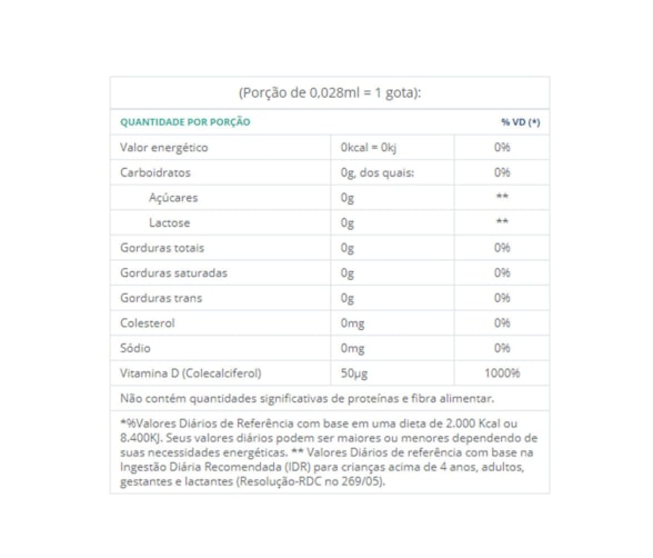 Ingerir 1 gota = 2000UI. 100% da IDR(Recomendação Diária) de vitamina D.