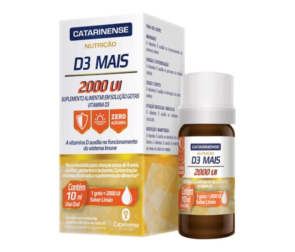 Vitamina D3 Mais 2000UI Catarinense - A vitamina D auxilia na formação de ossos e dentes, na absorção de cálcio e fósforo e no funcionamento muscular - A vitamina D auxilia no funcionamento do sistema imune, na manutenção de níveis de cálcio no sangue e no processo de divisão celular - Vitamina D 2000UI em gotas tem sabor limão, que pode ser usada por toda a família, a partir de 9 anos.