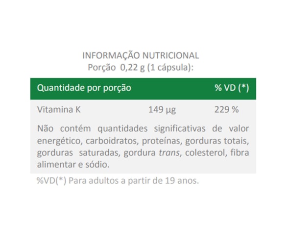 veículo óleo de girassol, menaquinona-7 (vitamina K2), gelificante gelatina, umectante glicerina, emulsificante lecitina de soja, veículo água purificada, antioxidante DL-alfa-tocoferol e corantes INS 171, INS 110 e INS 129. Colorido Artificialmente.