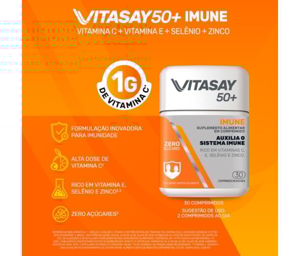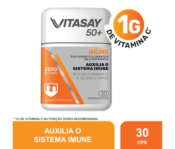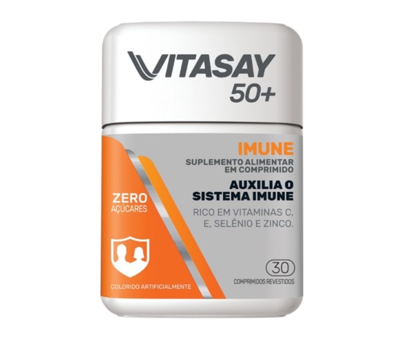 Vitasay 50+ Imune é um suplemento alimentar em comprimidos desenvolvido especialmente para homens e mulheres a partir dos 50 anos. Com uma fórmula inovadora contendo altas doses de Vitamina C, ajuda a fortalecer o sistema imunológico, contribuindo para uma vida mais saudável e disposta. Também é rico em Vitamina E, Selênio e Zinco, sem adição de açúcares.