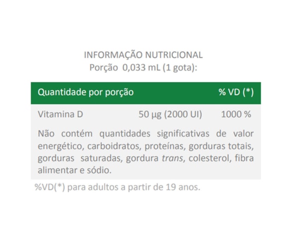Apresentação/Embalagem: frasco contendo 20 mL, sendo 2000 UI de vitamina D3 por gota.