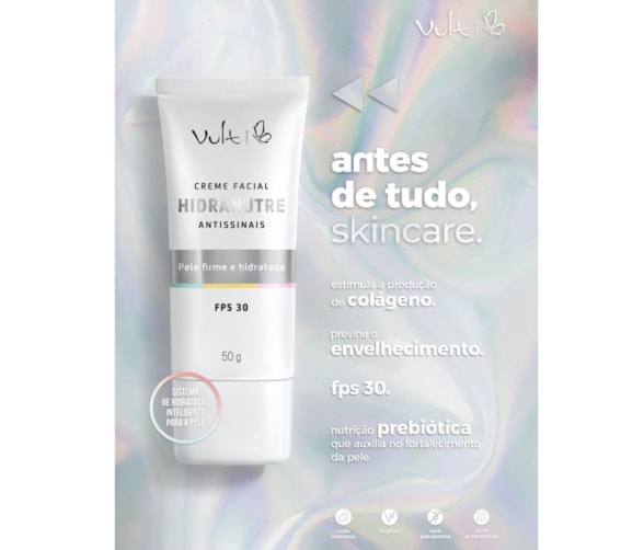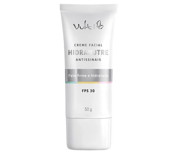 Vult Hidranutre Creme Antissinais Facial - Estimula a produção de colágeno, mantendo a pele mais firme e saudável - Melhora os sinais de envelhecimento e a uniformidade da pele - Enriquecido com extarto de semente de uva que possui ação antioxidante - Além de niacinamida que possui ação de nutrição prebiótica que auxilia a fortalecer a defesa natural da pele - Efeito matte fps30