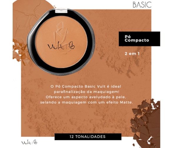 Vult Pó Compacto Facial Basic 9g - PC12 - O Pó Compacto Basic Vut possui fórmula livre de parabenos e vegana, com partículas superfinas, que deixa a pele com aspecto aveludado, selando a maquiagem com um efeito matte - Vult Basic é enriquecido com vitamina E e pigmentos minerais micronizados, que protegem a make da oxidação e conferem cobertura com efeito natural matte e livre do brilho causado pela oleosidade.