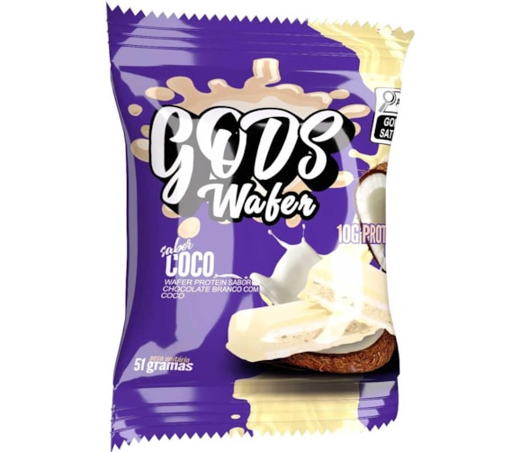 "GODS WAFER é uma barra de wafer proteica com zero adição de açúcar que chega para surpreender pela qualidade nutricional, sabor e maciez. SABOR DOS DEUSES A mais saborosa do mercado, são 10g de proteína por unidade. 2 deliciosos sabores que podem te acompanhar em qualquer momento: na atividade física, no trabalho, no conforto de casa, na correria de uma atividade para outra e onde mais imaginar. Uma forma simples e completa de matar a vontade de um doce sem comprometer a dieta. Perfeita também para ser levada alguns minutos ao microondas e ter uma explosão de sabor e consistência. BENEFÍCIOS - 10g de proteína ; - Sabor e cremosidade incomparável; - Estimula a recuperação e construção muscular; - Praticidade; - zero açúcar adicionado; - zero corantes; - Processo de filtragem diferenciado que confere textura e qualidade superior; INGREDIENTESSABOR COCO: Ingredientes: Cobertura proteica zero açúcar sabor chocolate branco (concentrado proteico de leite em pó, gordura vegetal, maltitol, soro de leite em pó, polidextrose, leite em pó desnatado, emulsificante: lecitina de soja e aromatizante idêntico ao natural), ganache branco zero açúcar sabor chocolate branco ( maltitol, oleína de palma, polidextrose, leite em pó, desnatado, soro de leite em pó, leite em pó integral, gordura vegetal, celulose microcristalina, emulsificantes: lecitina de soja, polisorbato sódico e aromatizante indêntico ao natural sabor vanilla), cobertura zero açúcar sabor chocolate branco (gordura vegetal, polidextrose, maltitol, soro de leite em pó, leite em pó integral, flocos de coco emulsificantes: lecitina de soja, polirricinoleato de poliglicerol e aromatizante iêntico ao natural), placa de wafer farinha de trigo enriquecida com ferro e ácido fólico, gordura vegetal, cloreto de sódio, emulsificante: lecitina de soja e fermento químico: bicarbonato de sódio. CONTÉM GLÚTEN. CONTÉM LACTOSE. ALÉRGICOS: CONTÉM DERIVADOS DE LEITE DE VACA, TRIGO E SOJA. PODE CONTER: AMENDOIM, AVELÃ E CASTANHA DE CAJU; DIABÉTICOS: CONTÉM AÇÚCARES NATURALMENTE PRESENTES NAS MATÉRIAS - PRIMASAPRESENTAÇÃO Contém 6 unidades de 51g."