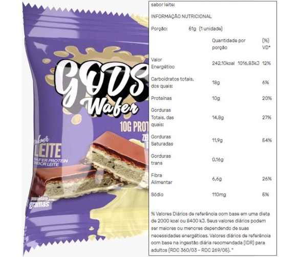 "GODS WAFER é uma barra de wafer proteica com zero adição de açúcar que chega para surpreender pela qualidade nutricional, sabor e maciez. SABOR DOS DEUSES A mais saborosa do mercado, são 10g de proteína por unidade. 2 deliciosos sabores que podem te acompanhar em qualquer momento: na atividade física, no trabalho, no conforto de casa, na correria de uma atividade para outra e onde mais imaginar. Uma forma simples e completa de matar a vontade de um doce sem comprometer a dieta. Perfeita também para ser levada alguns minutos ao microondas e ter uma explosão de sabor e consistência. BENEFÍCIOS: - 10g de proteína ; - Sabor e cremosidade incomparável; - Estimula a recuperação e construção muscular; - Praticidade; - zero açúcar adicionado; - zero corantes; - Processo de filtragem diferenciado que confere textura e qualidade superior; APRESENTAÇÃO: Contém 6 unidades de 51g. "