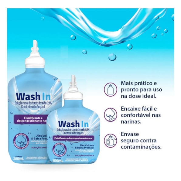 Wash In Solução Nasal 0,9% 200mL - Fluidificante e Descongestionante nasal - Higienize as narinas de maneira segura e eficaz - Mais prático e pronto para uso na dose ideal - Não tem necessidade de preparar, dissolver misturas ou ferver água - Ele vem pronto para o uso e na dose ideal!