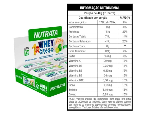 line-height:1.4;Descrição: As barras proteicas da Nutrata, são de longe o melhor alimento rico em vitaminas e proteínas para energizar e potencializar o seu dia e o seu treino, feitas com alto padrão de qualidade elas além de deliciosas são inesquecíveis e o incrível recheio de em stylefont-family:inherit;margin:0px;padding:0px;line-height:1.4;Torta de Limão, trazendo a cremosidade e uma torta com o sabor único de limão. As proteínas da Whey Grego Bar são obtidas por CFM (Cross Flow Microfiltration). Esse é um processo de filtragem 100% físico que promove proteínas não desnaturadas e de alto valor biológico. line-height:1.4;Ingredientes: Blend proteico (caseinato de cálcio, proteína concentrada do soro do leite, proteína isolada do soro do leite, proteina hidrolisada (colágeno)), cobertura de chocolate branco e recheio cremoso de chocolate branco com limão [glicose, óleo vegetal, emulsificantes lecitina de soja e polirricinoleato de poliglicerol, limo po)], sorbitol, polidextrose, oleo de palma, logurte grego natural po, fruto-oligossacarídeos, Orafti*® Synergy1 (inulina), umectante glicerina, mix de vitaminas [A (acetato de retinol), D3 (colecalciferol), B6 (piridoxina Hcl), B9 (ácido fólico), B12 (cianocobalamina)] e minerais [zinco (sulfato de zinco), selênio (selenito de sódio), cromo (picolinato de cromo)], aromas idênticos aos naturais, cloreto de sodio, emulsificante lecitina de girassol, conservantes sorbato de potássio e benzoato de sódio, antioxidante natural tocoferol e corantes amarelo tartrazina e azul brilhante. line-height:1.4;Adicionais: NÃO CONTEM GLUTEN;br stylefont-family:inherit;margin:0px;padding:0px;line-height:1.4; ALERGICOS: CONTEM DERIVADOS DE LEITE E SOJA;br stylefont-family:inherit;margin:0px;padding:0px;line-height:1.4; PODE CONTER AMENDOIM E AVELÃ; CONTÉM LACTOSE.