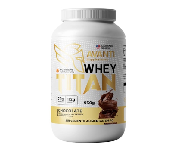 "O Whey Titan 930g sabor chocolate é o suplemento ideal para quem busca um aumento de performance nos treinos e resultados rápidos. Produzido com proteína isolada de alta qualidade, ele oferece uma absorção rápida, auxiliando na recuperação muscular e no ganho de massa magra. Com um sabor irresistível de chocolate, é uma opção deliciosa e nutritiva para complementar sua dieta. Importado, o Whey Titan garante excelência em sua fórmula, sendo uma escolha confiável para atletas e praticantes de atividades físicas. Aproveite os benefícios desse whey protein para potencializar seus resultados e atingir seus objetivos de forma eficiente. Benefícios do Whey Titan: Apoio ao Crescimento Muscular: O whey é rico em aminoácidos essenciais, ajudam a estimular a síntese de proteínas musculares. Melhora na Recuperação Muscular: O whey é capaz de acelerar a recuperação dos músculos, proporcionando os nutrientes necessários para reparar as fibras musculares danificadas. Ajuda no controle de peso: O whey fornece a sensação de saciedade, o que pode reduzir o apetite e ajudar no controle da ingestão calórica. Apoio ao Sistema Imunológico: O whey protein contém imunoglobulinas e lactoferrina, que ajudam a fortalecer o sistema imunológico. Whey Titan Importado: Marca: Avanti Supplements. Origem: Importada / Estados Unidos. Sabor: Chocolate. Cada embalagem contém 930g. Valor Nutricional por Porção: 20g. Recomendação de uso: Misture 1 scoop de medida (aprox. 31g) na bebida de sua preferência, uma vez ao dia. Composição: Proteína de soro de leite concentrado, dióxido de silício, cacau em pó, sabor natural de chocolate amargo belga, goma guar, goma xantana. NÃO CONTÉM GLÚTEN."