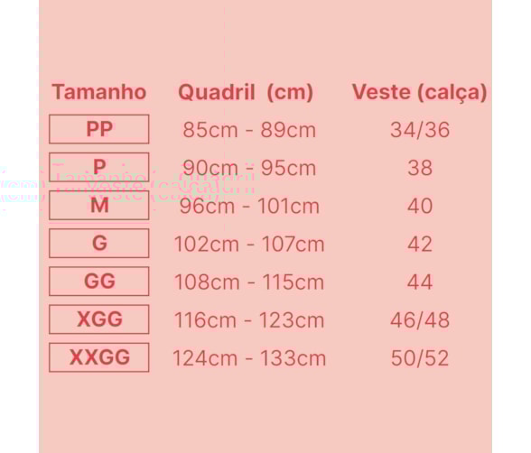 Tamanhos (referente à circunferência do quadril)