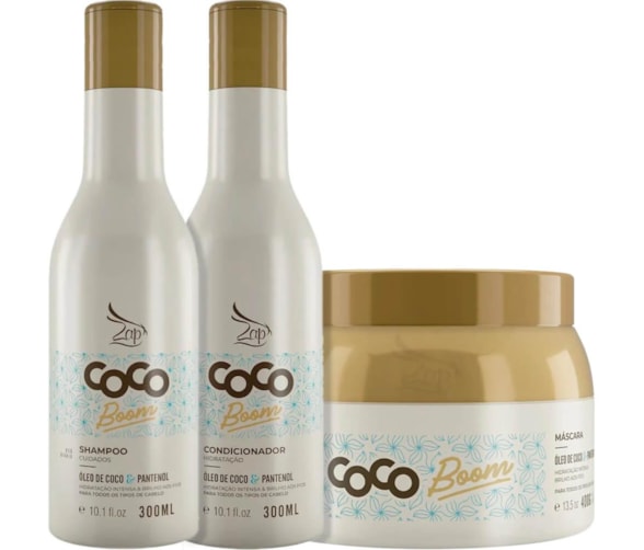 Zap Coco Boom - Shampoo Hidratação e Brilho 300ml: promove uma limpeza suave, removendo os resíduos acumulados que deixam os cabelos opacos, pesados e sem vida. Zap Coco Boom - Condicionador Hidratação e Brilho 300ml: desembaraça e restaura os fios danificados. Zap Coco Boom - Máscara Hidratação e Brilho Intensa 400g: repara e nutre os fios mantendo os fios tratados por mais tempo.